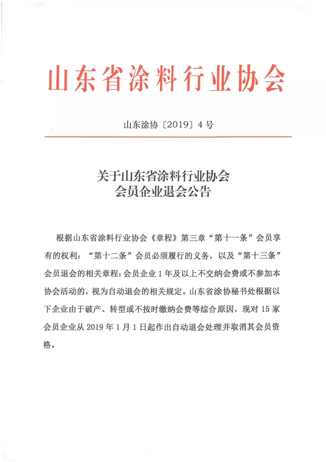 根据山东省涂料行业协会《章程》第三章“第十一条”会员享有的权利:“第十二条”会员必须履行的义务,以及“第十三条”会员退会的相关章程:会员企业1年及以上不交纳会费或不参加本协会活动的,视为自动退会的相关规定。山东省涂协秘书处根据以下企业由于破产、转型或不按时缴纳会费等综合原因,现对15家企业从2019年1月1日起作出自动退会处理、取消会员资格或取消会员待遇的决定。